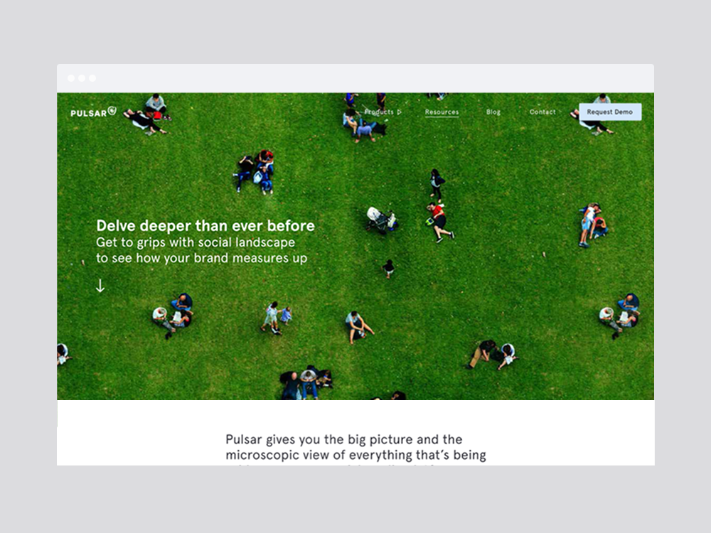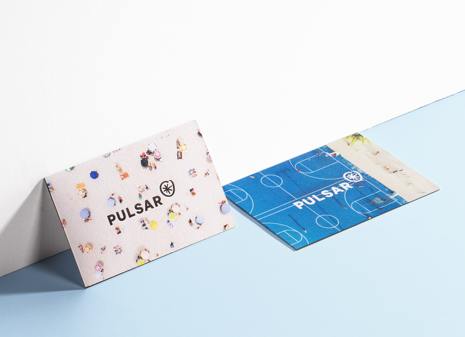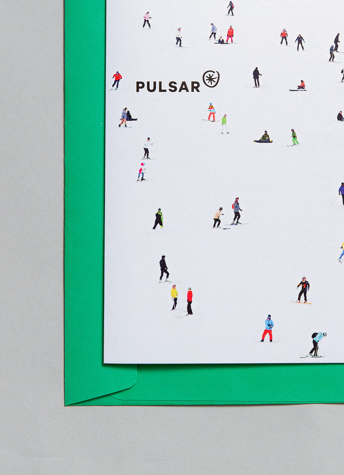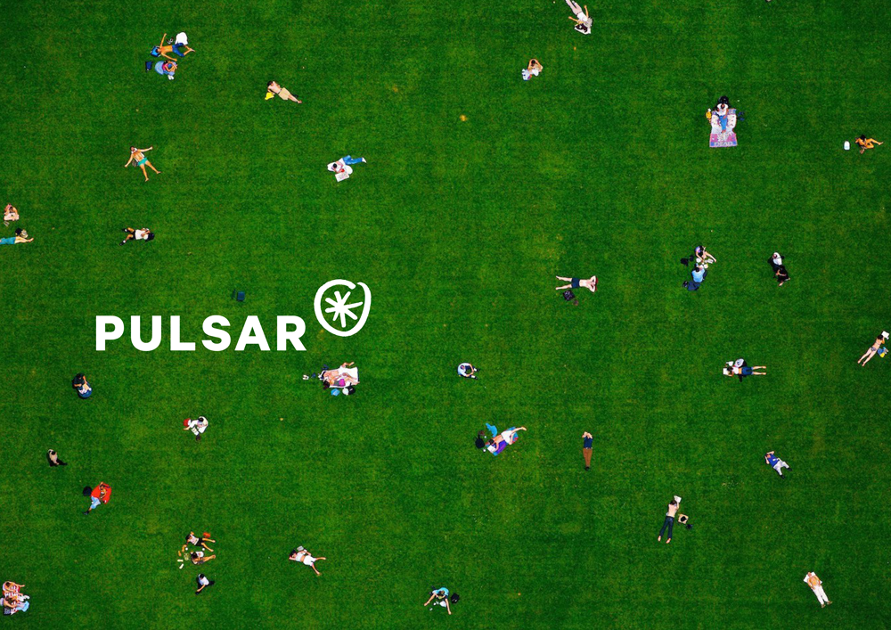 The hand drawn social media diagram / asterisk / pulsar part of the logo represents the humanistic side of the brand, whilst photography showing patterns and people describes Pulsar’s work analysing patterns in human behaviour. The colour palette, centred around blues and greens, references the design language often used within the industry.